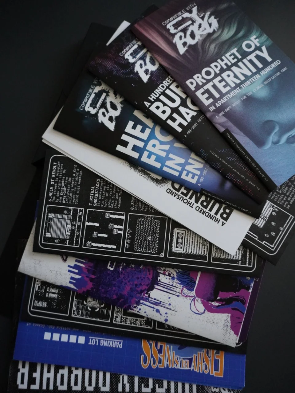 High octane, psychedelic collection of cyber weird adventures. 7 pamphlets, a dungeon-map, a full zine adventure, and a NPC card, for the iconic cyberpunk game CY_BORG.